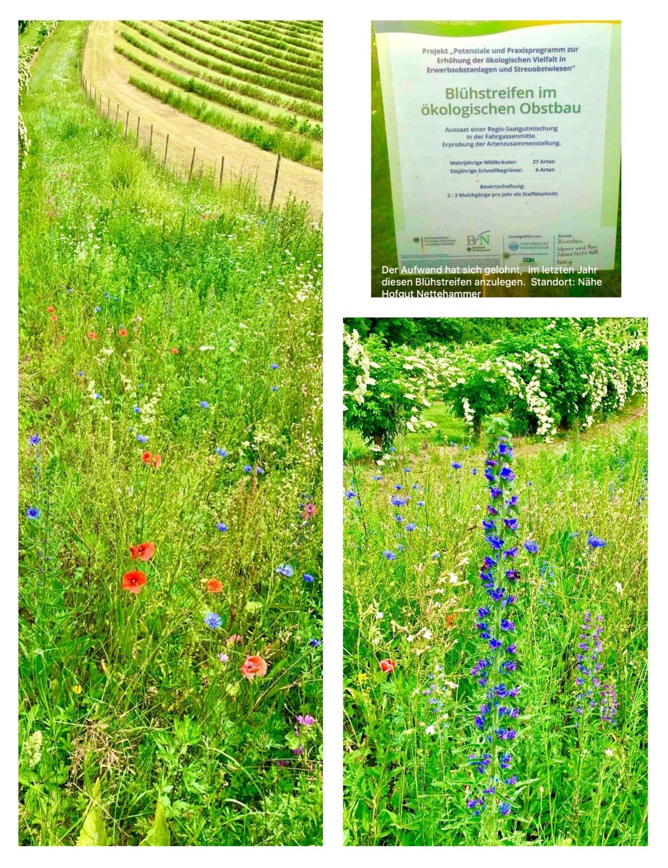 Durch diese Blühstreifen wird die ökologische Vielfalt erhöht. Dies ist ein großer Beitrag zum Erhalt der Artenvielfalt in den Streuobstwiesen und Obstanlagen.